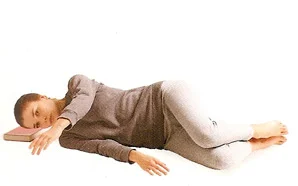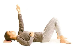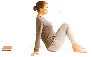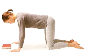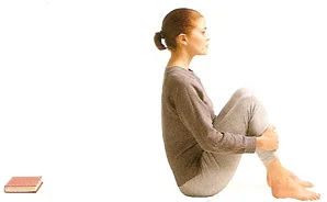 Place a paperback book (6 – 10 cm high) as support under your head, so the head is a counterbalance for the deep neck muscles. Sit on the floor in front of the support. Ensure the floor is carpeted or use a yoga mat.
