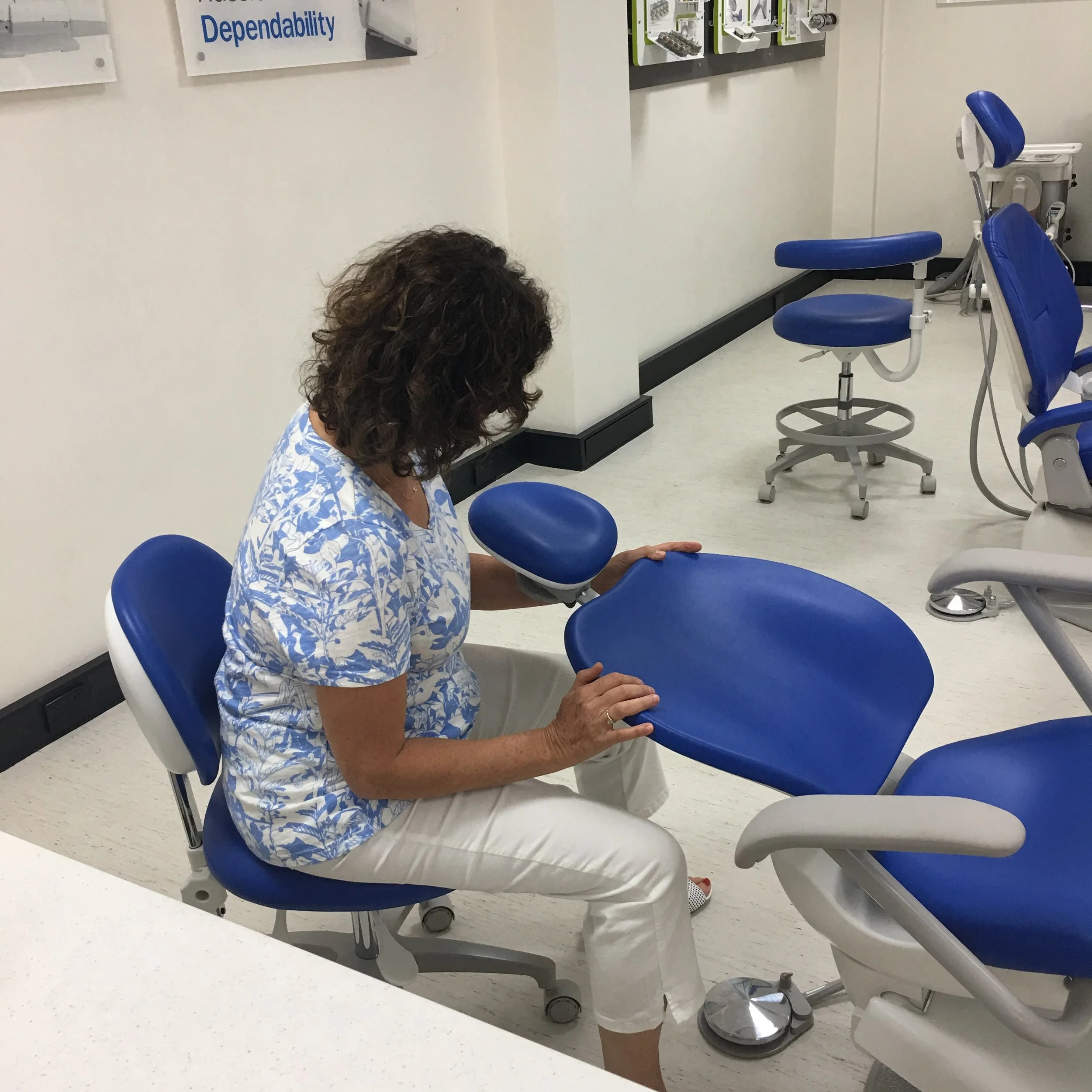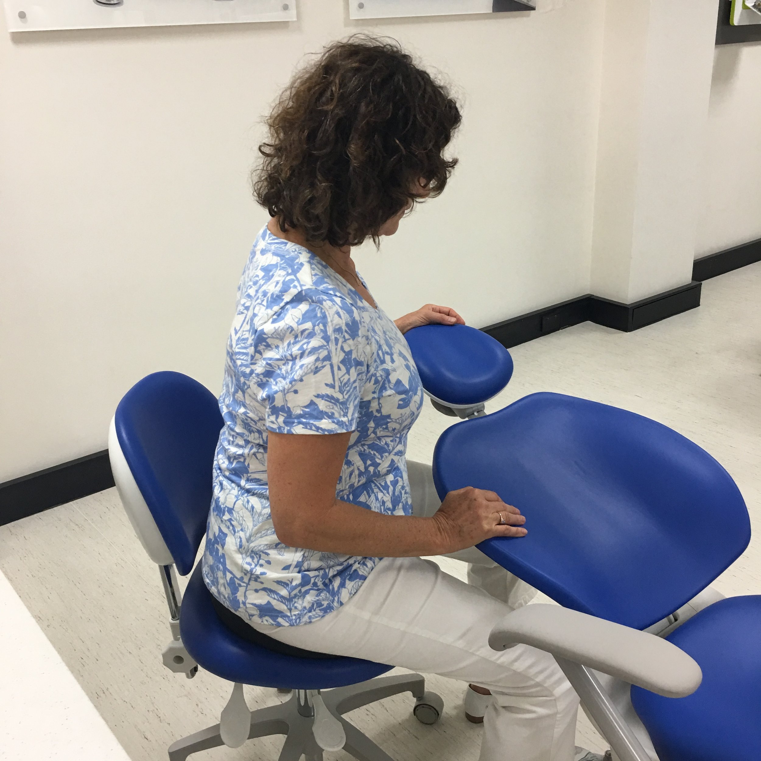 In the Optimum Dental Posture Workshops dental practitioners train in Inner Ergonomics, learning how to sit on their sit bones and pivot forward at the hip joints without distorting their spine as they gain access to their patients’ mouths. Unfortunately most dental stools lack a firm seat and a forward sloping adjustment, leaving clinicians unable to sit well and look after themselves in the dental surgery.